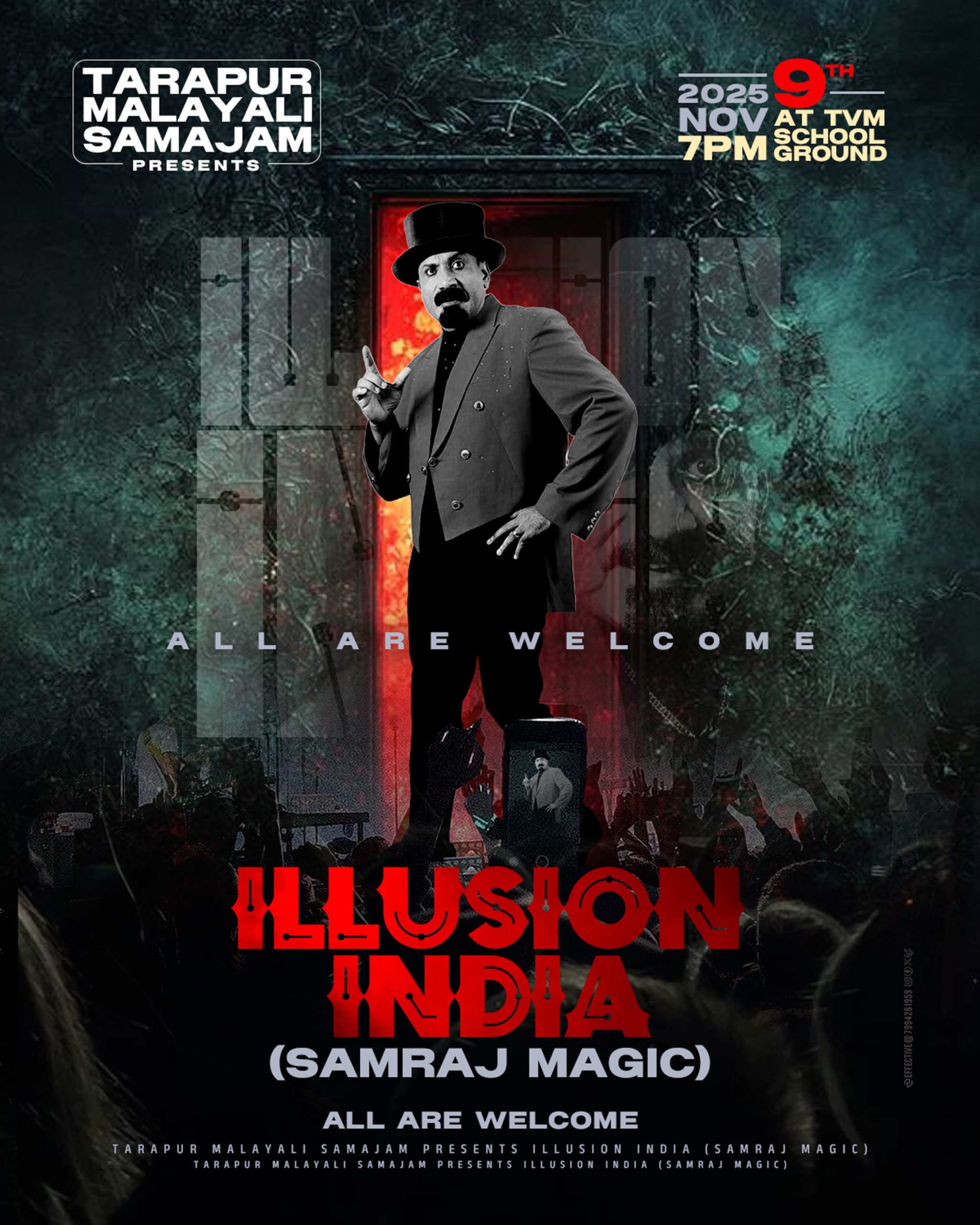 മജീഷൻ സാമ്രാജിന്റെ ഉത്തരേന്ത്യൻ പര്യടനത്തിന്റെ ഭാഗമായി നടത്തപ്പെടുന്ന ഇല്ല്യൂഷൻ ഇന്ത്യ മെഗാ മാജിക് ഷോ 2025 നവംബർ 9 ന് ബോംബെ താരപ്പൂർ .ടി വി എം സ്കൂൾ ഗ്രൗണ്ടിൽ വെച്ച് നടത്തപെടുന്നു. ആധുനിക ജാലവിദ്യാരംഗത്ത് ഏറെ ശ്രദ്ധേയനായ ഒരു ജാലവിദ്യക്കാരനാണ് മജീഷ്യൻ സാമ്രാജ്. മാജിക്, മെന്റലിസം, ഡാൻസ് എന്നിവ സമനയിപ്പിച്ചുകൊണ്ട് ന്യുതന സാങ്കേതിക വിദ്യയുടെ അഗംപടിയോടെ നടത്തപ്പെടുന്ന ഷോ തീർത്തും ബോംബെ നിവാസികൾക്ക് വേറിട്ട ഒരനുഭവമായിരിക്കും. മുംബൈ മലയാളികൾക്ക് വേണ്ടി പരിപാടി അണിയിച്ചു ഒരുക്കുന്നത് താരപ്പൂർ മലയാളി സമാജമാണ്. വ്യത്യാസ്തമായ വഴികളിലൂടെ സഞ്ചരിക്കുന്ന സമാജം എന്നും മുംബൈ മലയാളികൾക്ക് ആവേശമാണ്. വൈകിട്ട് 7 ന് പരിപാടി ആരംഭിക്കും.